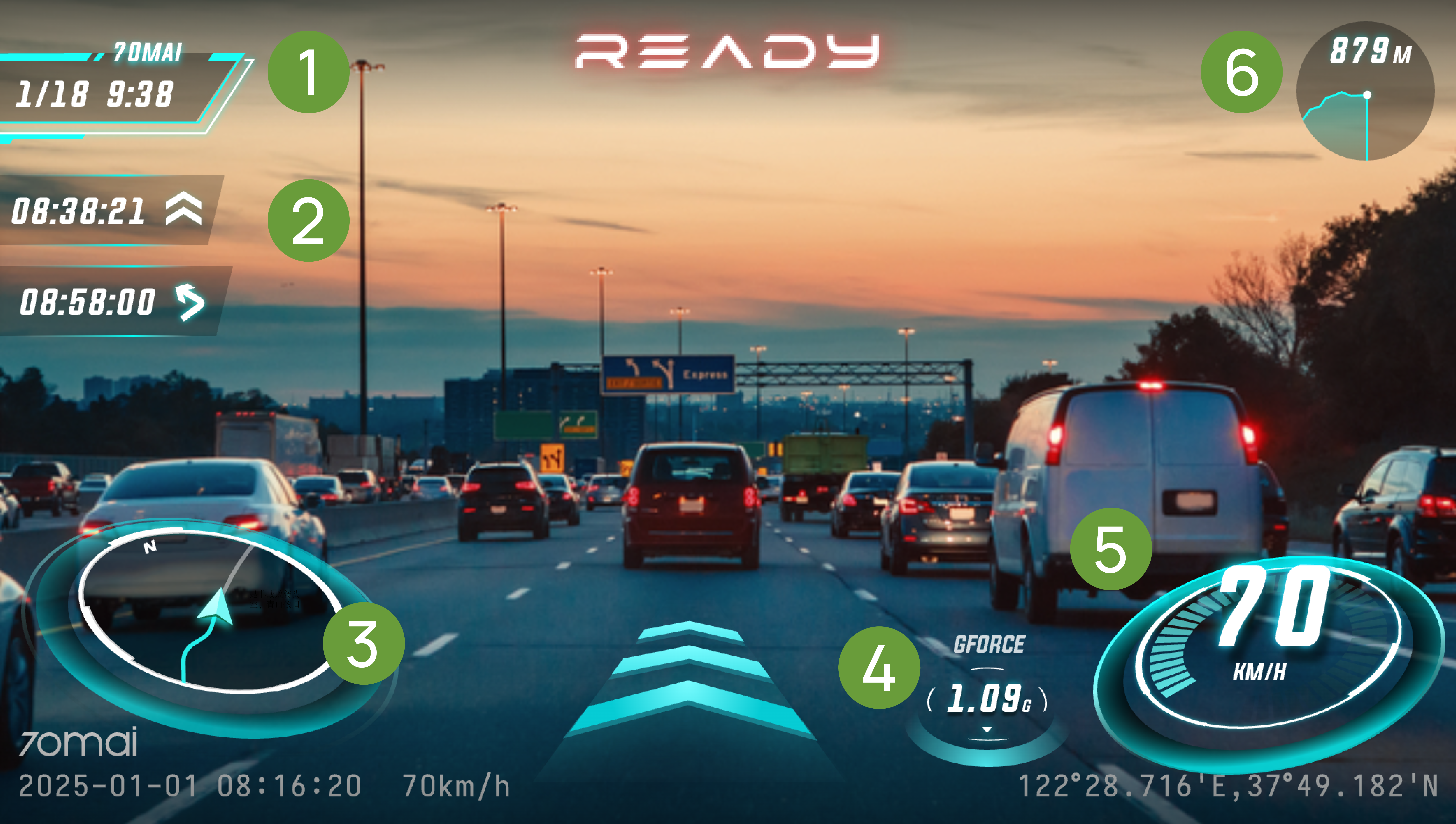 The dash cam records driving data and road condition data as well. Such data will be displayed together with the video during playback. The road story (RS) filter can merge the data and display video clips with stunning visual effects.